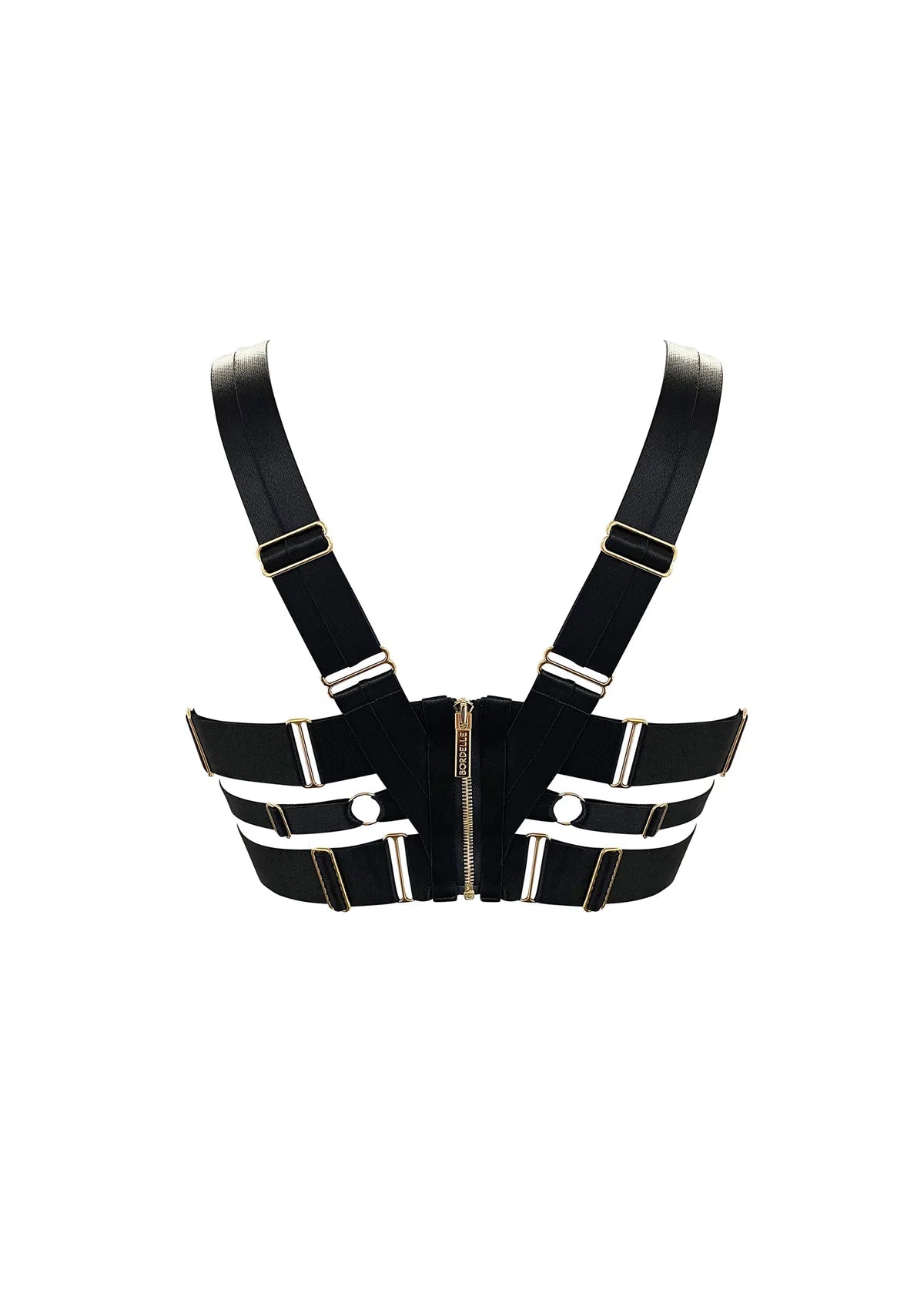 A silk satin bodice bra with lightly padded cups and a balconette wire for lift and support. The cups feature removable cookies for optional extra lift. Oversized 24k gold plated ‘O’ rings decorate the elastic panelled shoulder straps, and adjustable soft wide band elastic straps centre towards the zip fastening at the back.