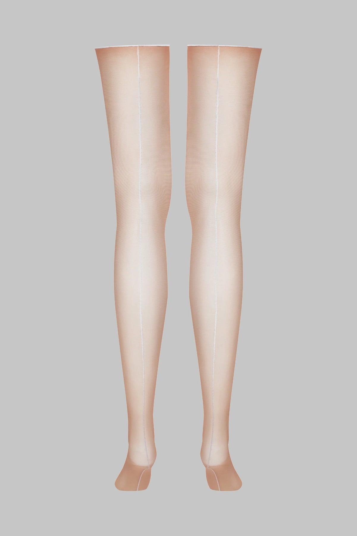 Maison Close's signature cut and curled stockings. Iconic 20 denier nude with white seams stockings that pair with Maison Close's Pure Tentation line in white.