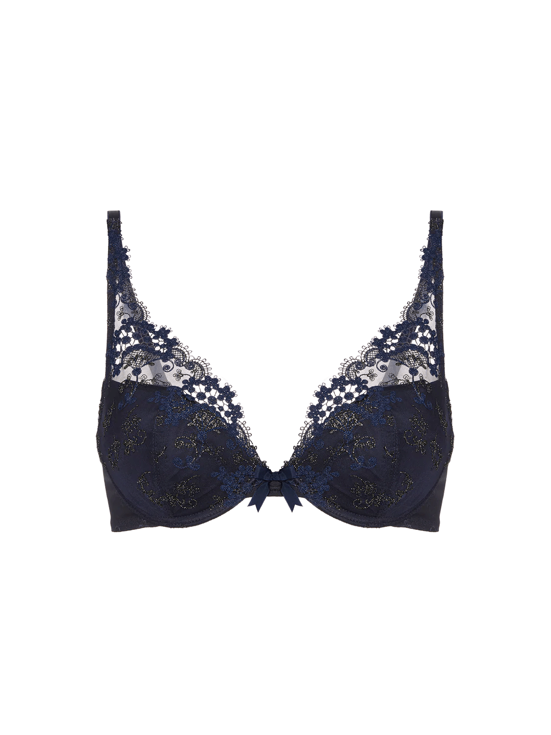 Longing for a bra that lifts, shapes and captivates all at once? This show-stopping embroidered triangle contour bra is a masterpiece of French style and seduction. The center plunges, the cups lift and the cascading against-the-skin floral embroidery will take your breath away. Dazzling lurex threading finishes the look.