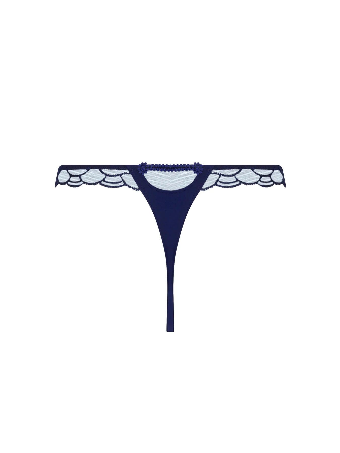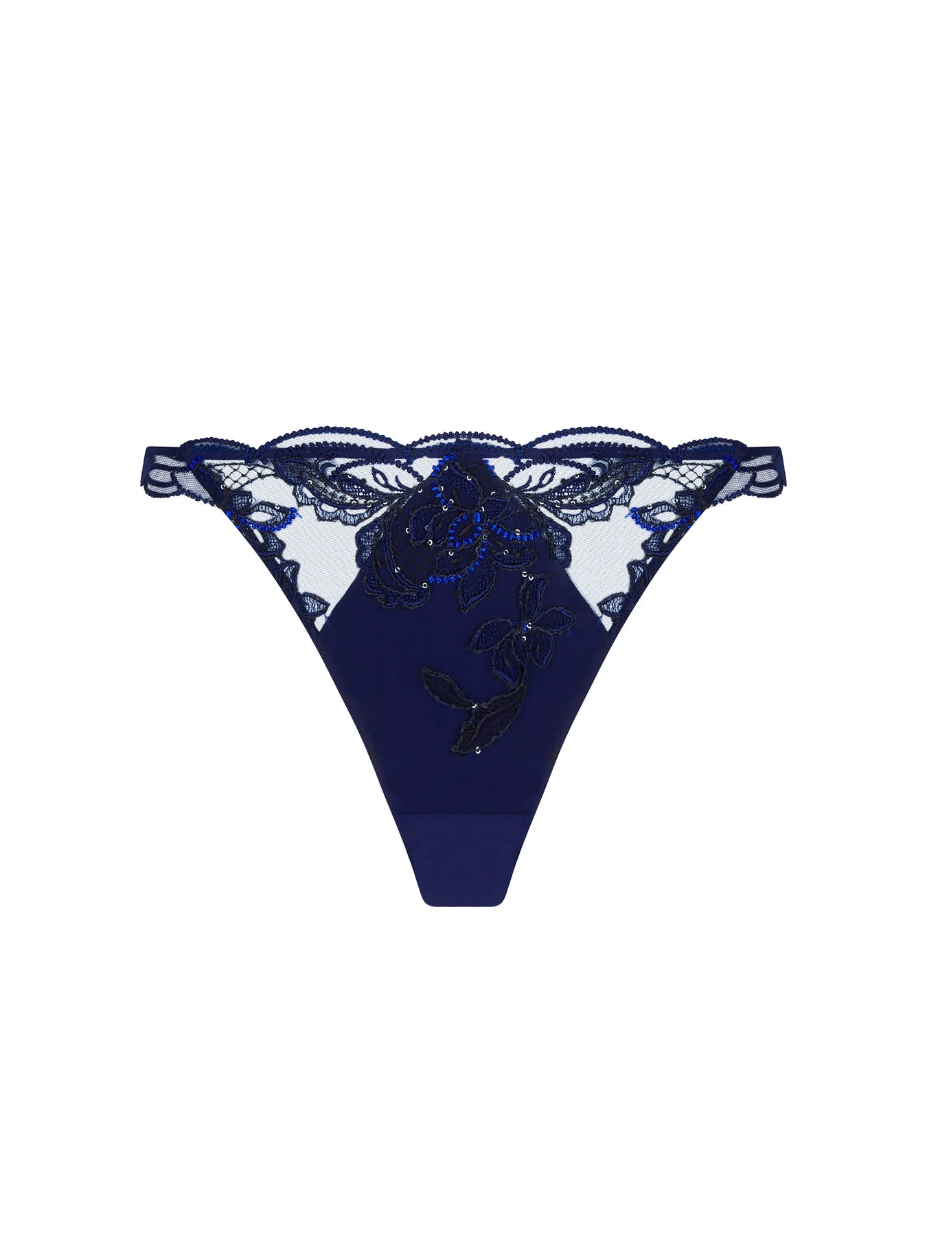 • Front in scalloped embroidery with sequins. Back in satin knit with sheer tulle insert and guipure motif.