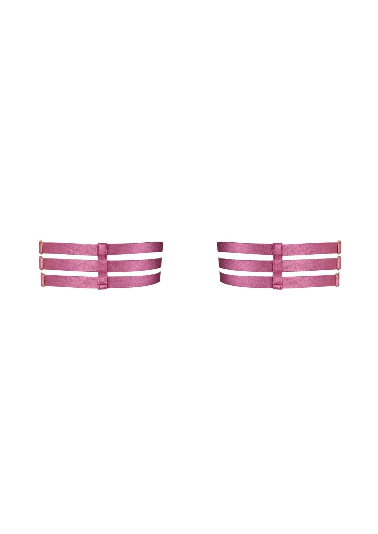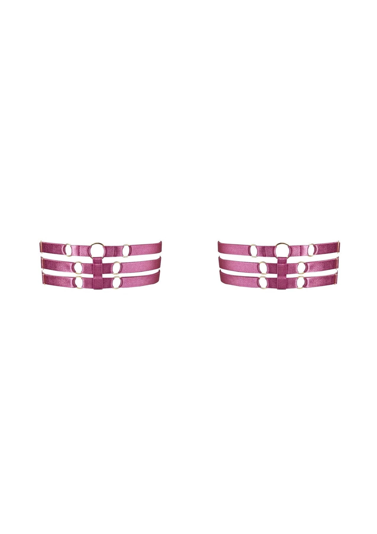 This pair of strap legs garters features slim satin elastic bands and precise ring placement to secure to the multitude of suspender options in the Siren and Melusina collections. Sleek and minimal, they decorate the thigh with elegant lines and 24k gold plated hardware. A refined accessory that compliments any look.