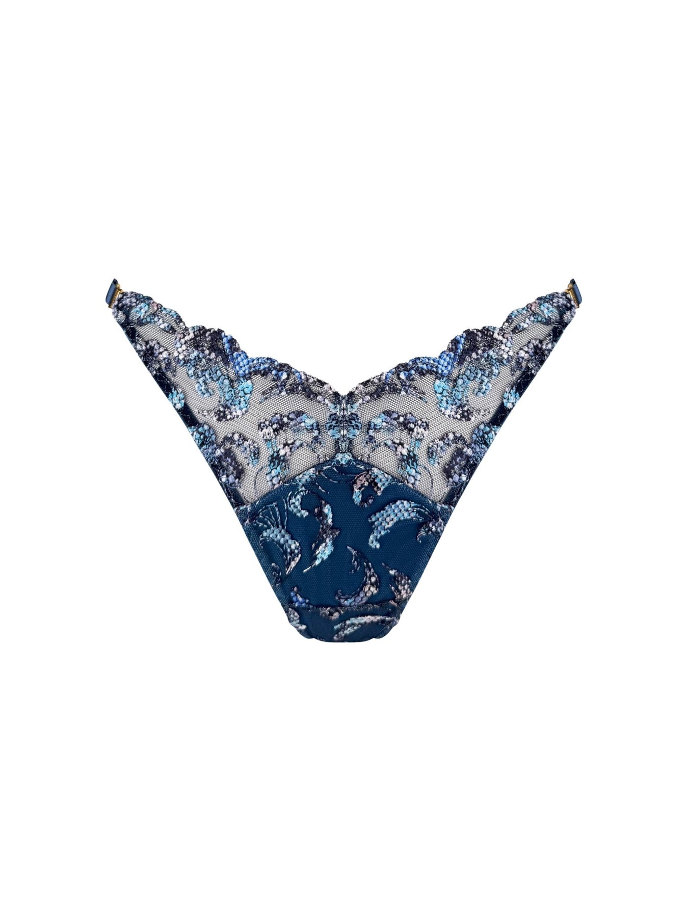 A high-leg lace thong designed to flatter and shape over the hips. Striking embroidered tulle creates the front whilst the mesh thong strap ensures comfort at the back. 24k gold plated swan hook fastenings at the top of the thong strap introduce ease when styling.