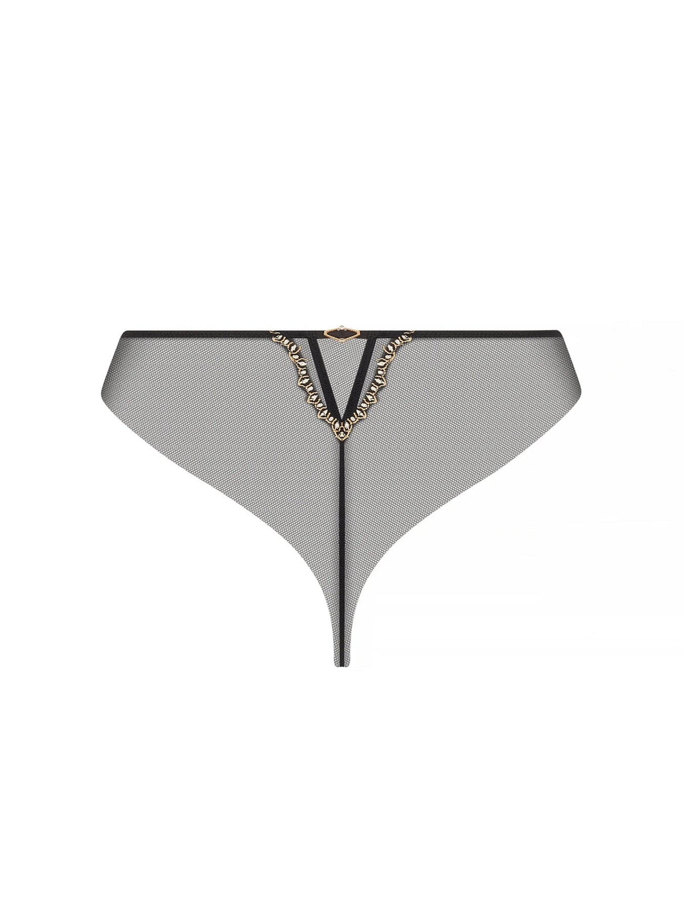 Front in silk satin with embroidery on tulle, sides in tulle. Back in tulle folded in two for greater invisibility. Embroidered back triangle encircling a transparent tulle insert adorned with a gold rhinestone jewel held by a silk satin ribbon.