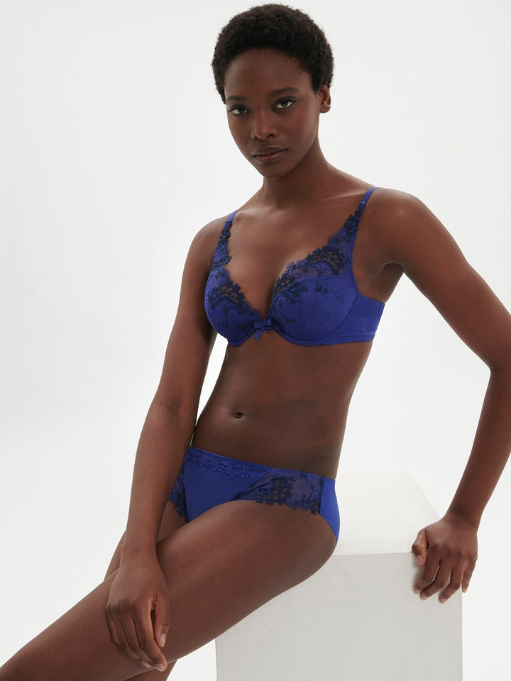 Longing for a bra that lifts, shapes and captivates all at once? This show-stopping embroidered triangle contour bra is a masterpiece of French style and seduction. The center plunges, the cups lift and the cascading against-the-skin floral embroidery will take your breath away. Matte Italian satin Jacquard finishes the look.