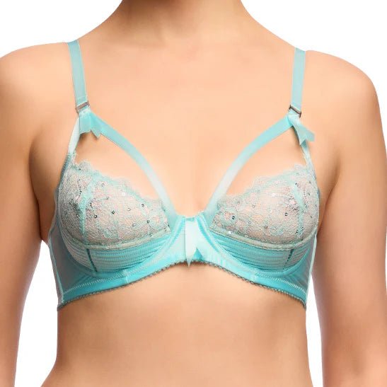 The Madame X Underwire Bra  has been bejeweled with sequins for this collection. The underwire bra offers shape and support with lace inserts covered in sequins and strap detailing. This bra has Dita's signature gate back. This is a new look for Dita's Iconic Bra.