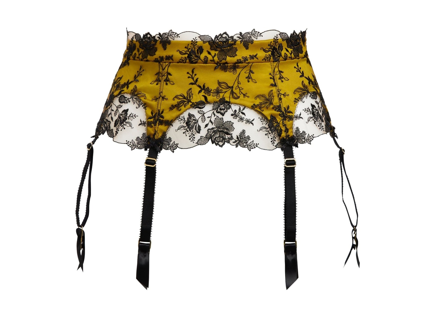 Dita loves combining her love of embroidered detailing on sheer tones. The Victresse suspender  is vintage inspired and features a wide embroidered front over contrast satin which sits high at the waist. The suspender has 6  garters for stability and function. This is a must for lingerie lovers.