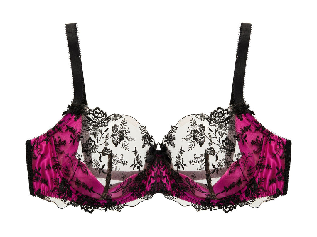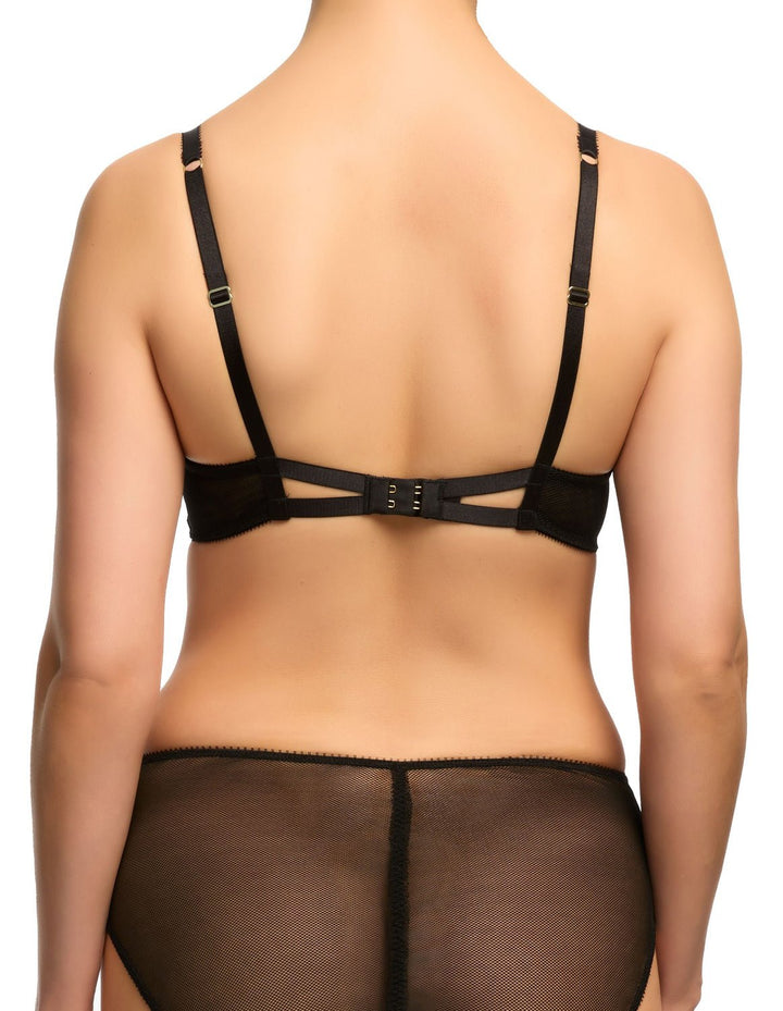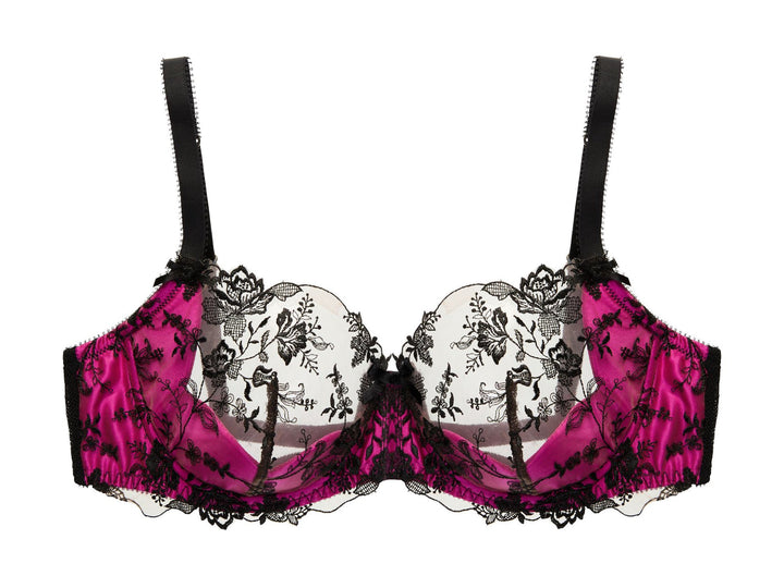 The Victresse bra is a beautifully sculptured balconette bra featuring a delicate floral embroidery on a sheer tuile mesh. The bra cups are sheer and feature Dita's signature petal lift satin inserts which create subtle lift and a beautiful shape. Satin bow trim detail and Dita's signature gate back.