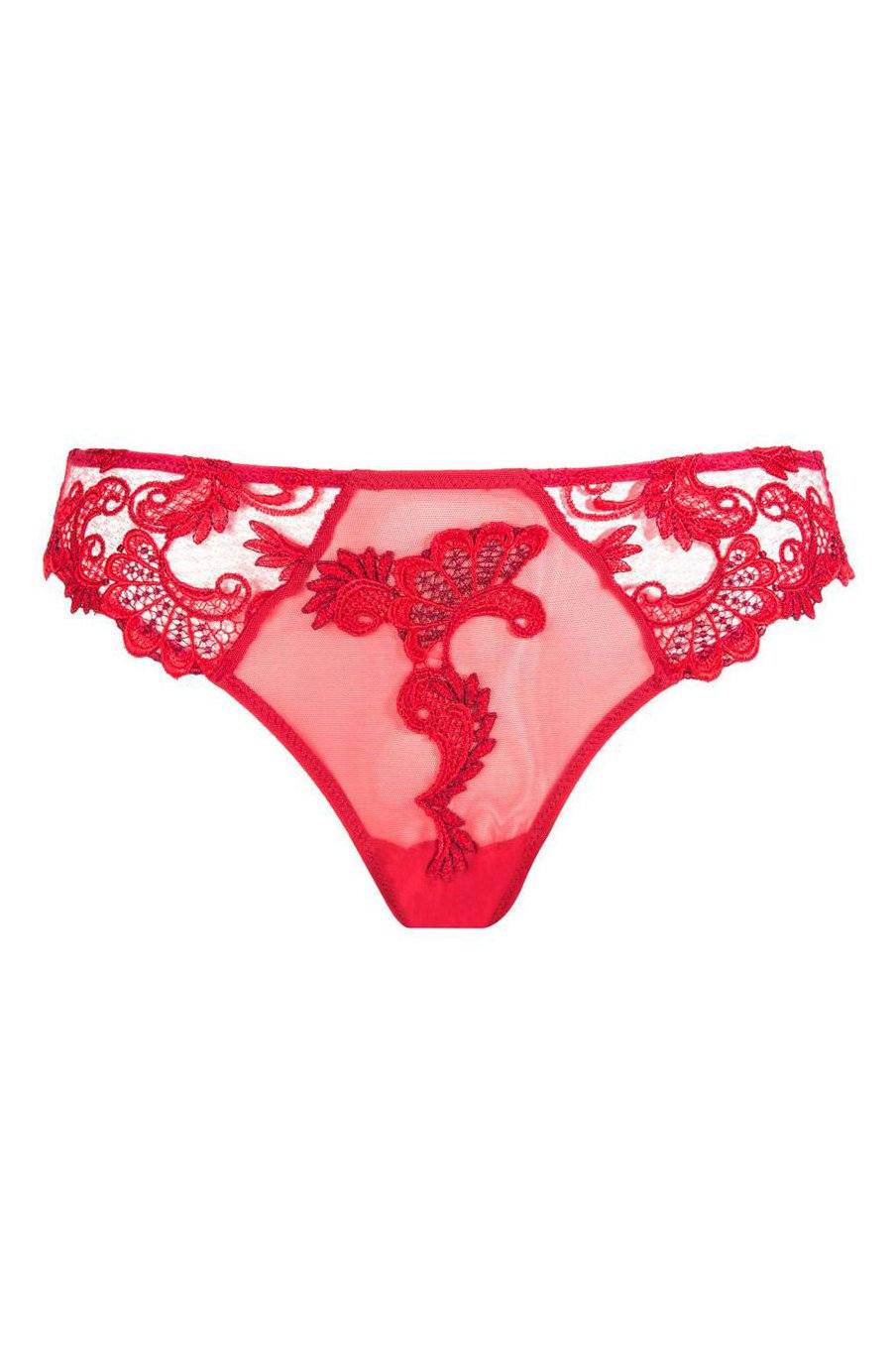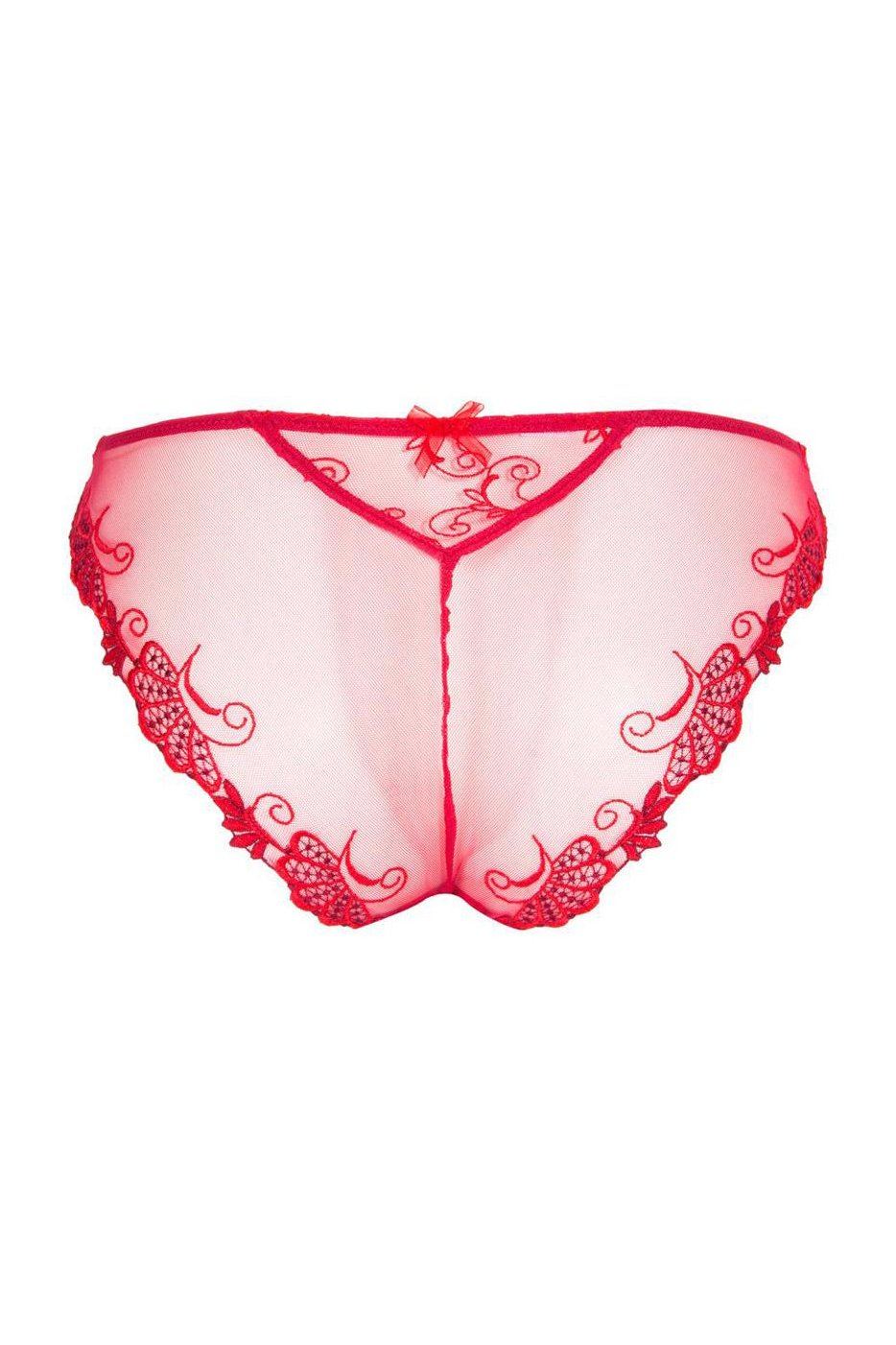 - Seduction brief in tulle quite indented at the front. This brief reveals the bottom with sensuality. Guipure yokes for tatoo effect.