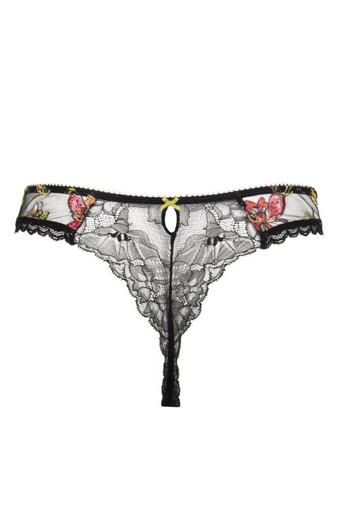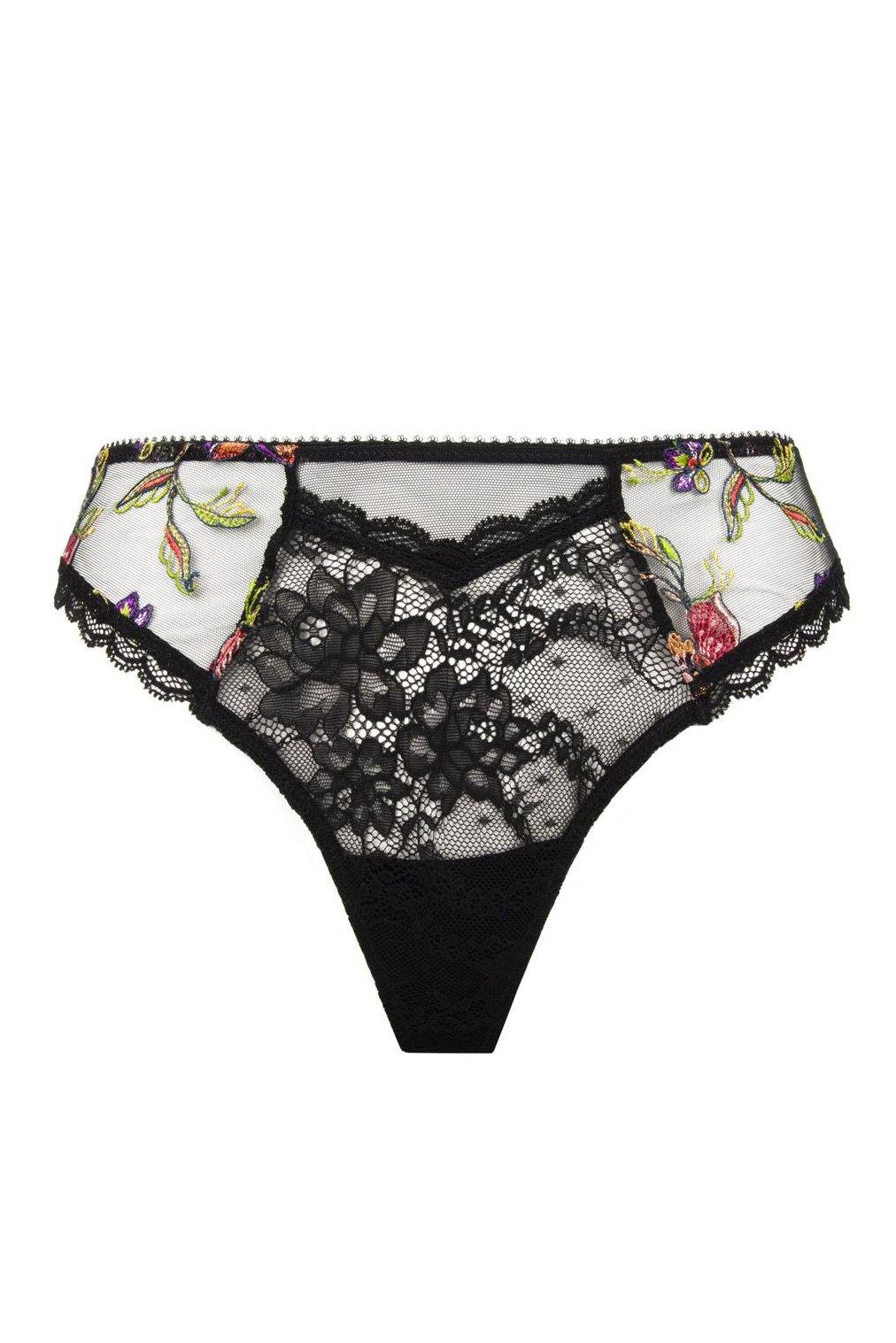 Beautifully elegant Leavers lace and embroidered tulle thong. Its high cut reveals the body while offering total freedom of movement. At the front, flowers bloom on the curves while the lace hints at the skin. Its scalloped cuts embellish the upper legs. The back features an opening topped with a small bow for a very sexy look.