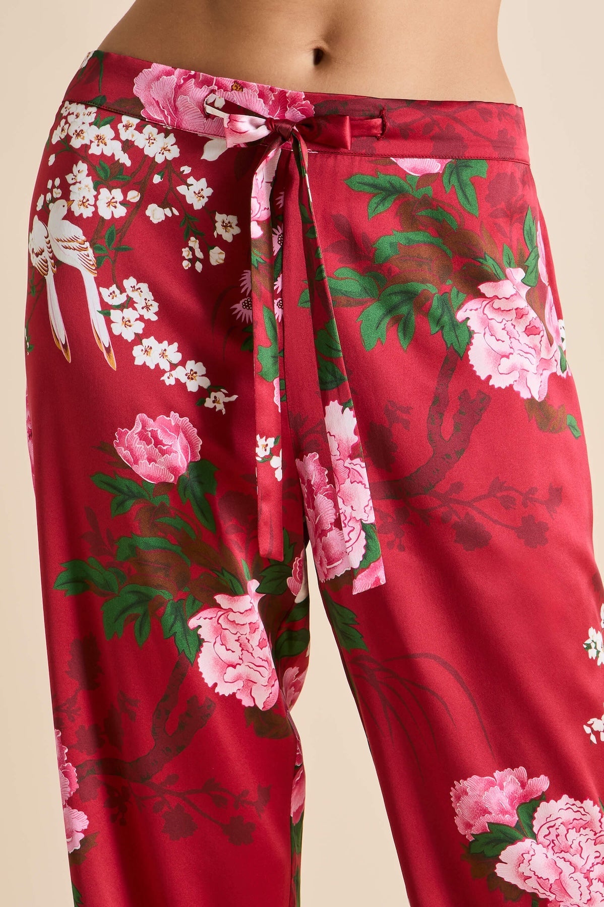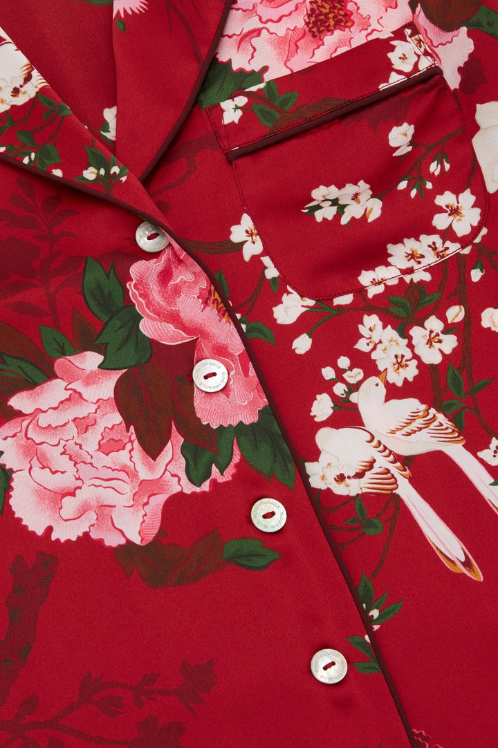 Immerse yourself in a flourishing garden by way of the Lila Tardieu Red floral Silk pajamas. She’s a new-season reinterpretation of our bestselling silhouette, which pairs a classic nightshirt with a relaxed-fit trouser, and is screen-printed with depictions of oriental flowers and birdlife that draw inspiration from the Art Nouveau era.