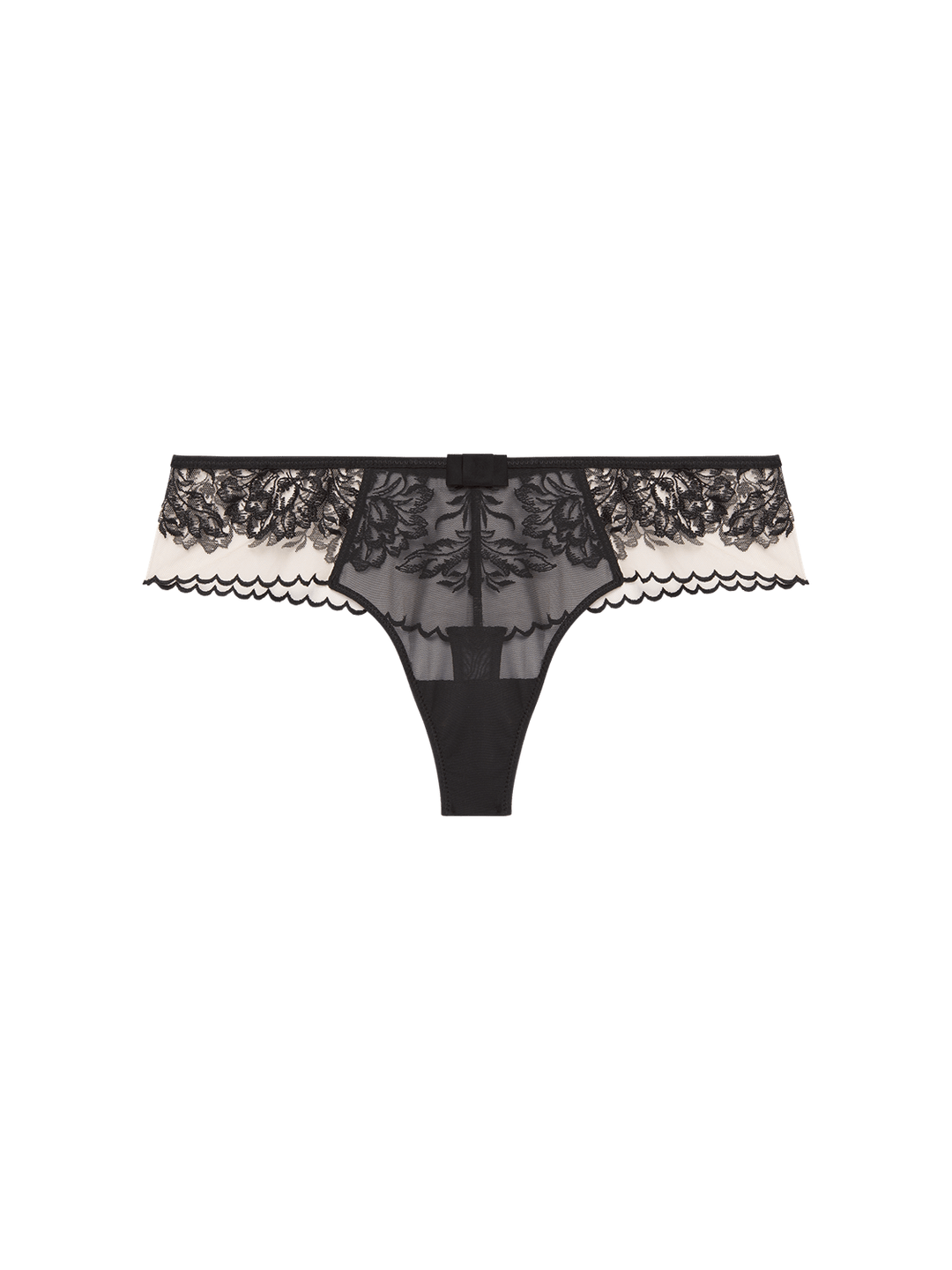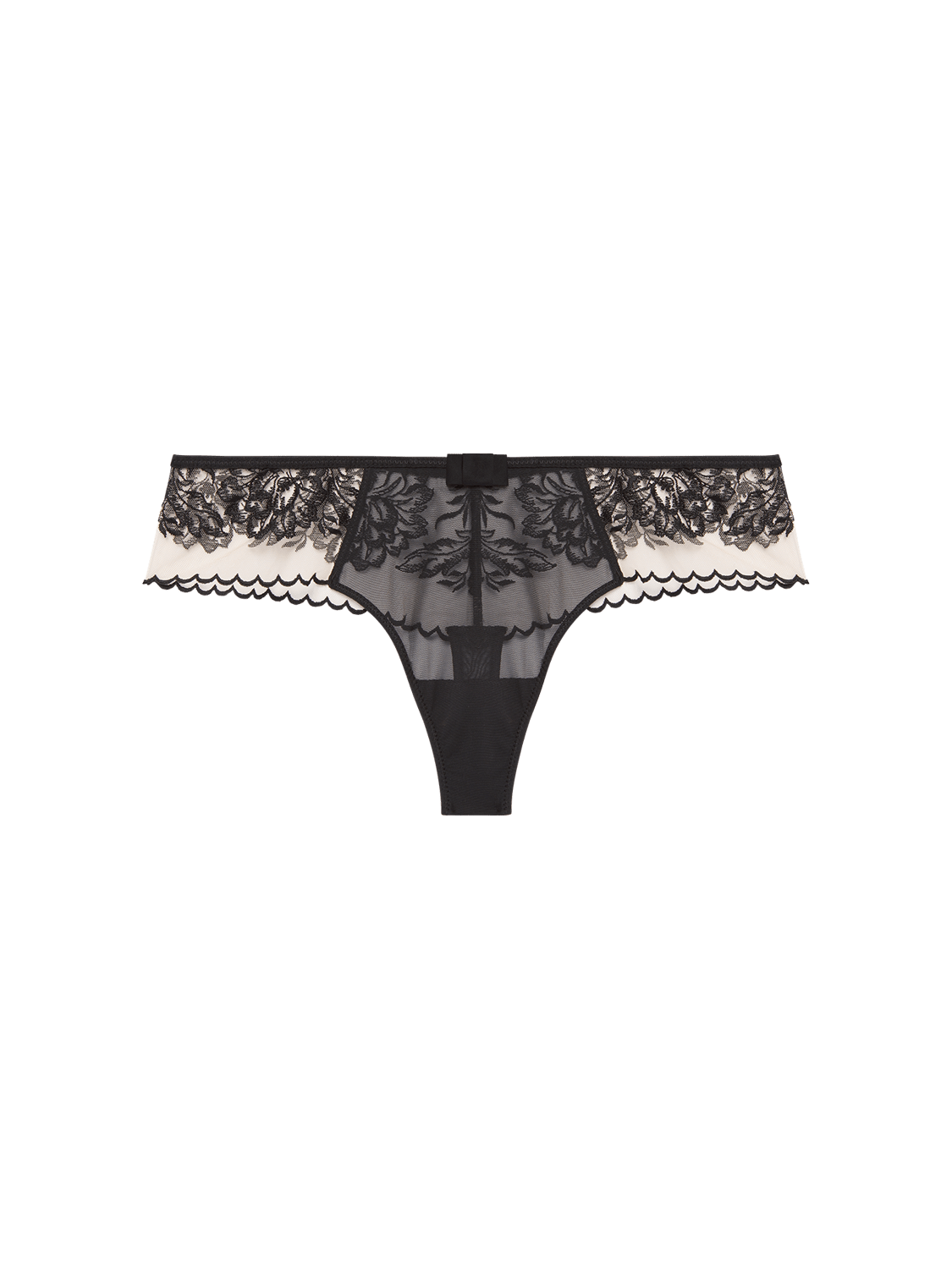 Fall in love with the Romance Tanga—a cheeky panty in sheer tulle and intricate floral embroidery. Finished with delicate scalloped trim and a decorative center bow. Limited edition.